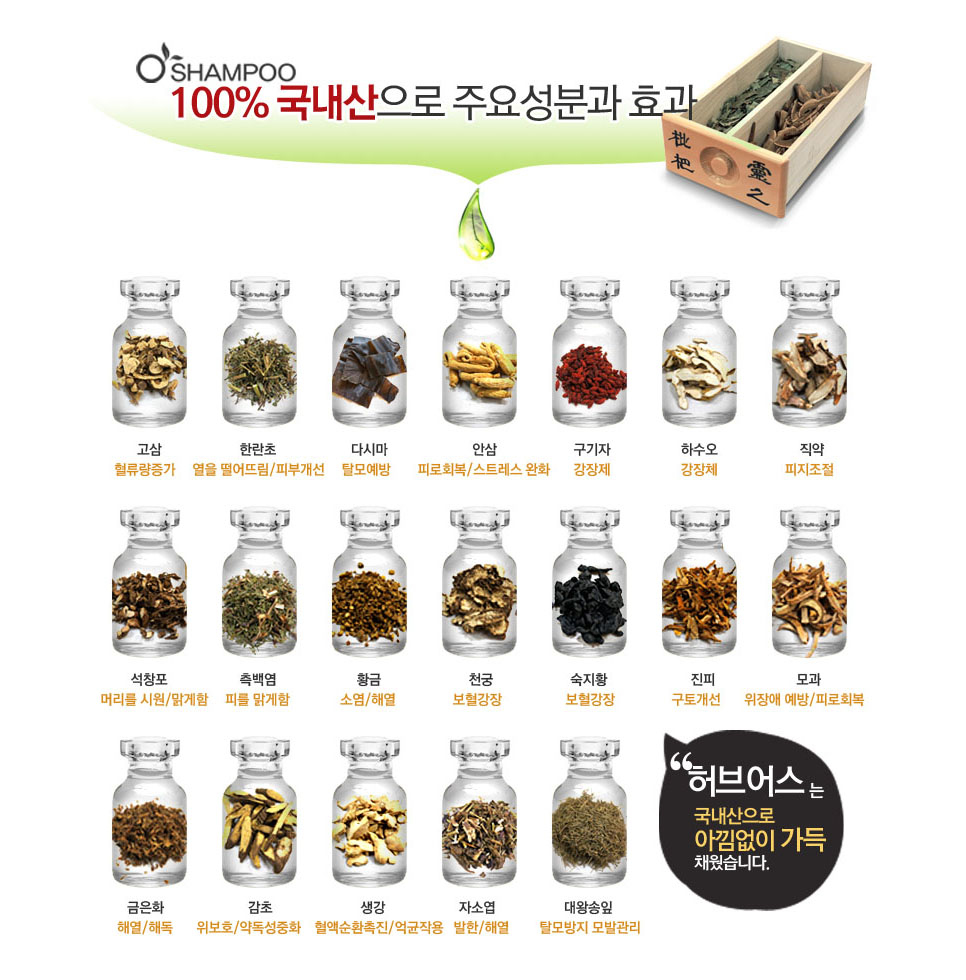 Shrubby Sophora -- False Daisy -- Kelp -- Ginseng -- Chinese Matrimony Vine -- Wilfordii Root -- Peony Root -- Sweet Flag -- Biotae Cacumen -- Skullcap -- Cnidium -- Rehmannia Glutinosa -- Dried Orange Peel -- Quince -- Lonicera Aflower -- Licorice -- Ginger -- Perilla Frutescens -- Longleaf Pine -- Rosemary Leaf -- Tea Tree Leaf -- Comfrey Leaf -- Nettle