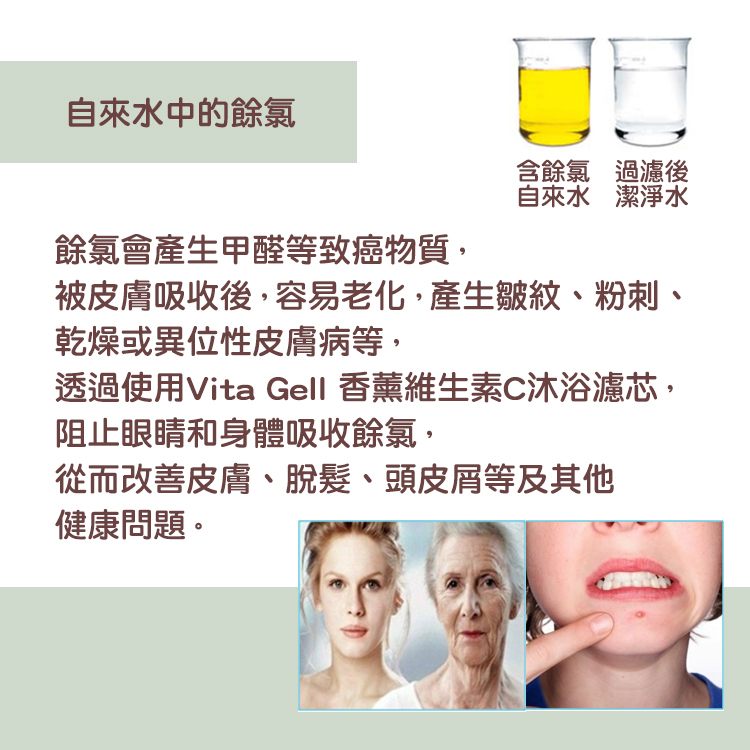 去除在自來水中的餘氯,從而保護身體不被淋浴時透過皮膚吸收接觸氯氣。